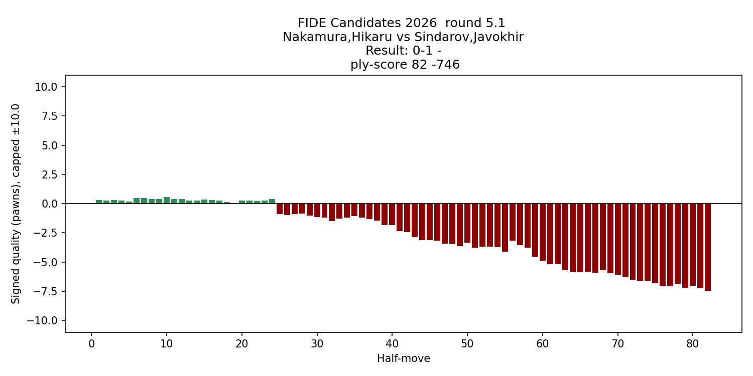 Round 5 brought more bad luck continues for Nakamura, he ran into the red hot Javokhir Sindarov. Finally Nakamura gets a shot with the white pieces but he was up against up and coming gm from Uzbekistan, who now has won 4 out of 5 game. Sindarov sits at the top of the leader board, while number one seed Nakamura is tied for last place with 1.5 out of 5 . Nakamura has been bothered by the very tight security at the candidates match. He spend over 67 minutes on his 13th move in this game, which is quite surprising this early in a classical chess game. This is an indication of lack fo preparation.