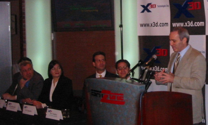 EXCERPTS FROM GARRY KASPAROV 'S SPEECH : : Kens (NYC Sports Commissioner) last words …. Were not very optimistic …. I will probably be more optimistic … I played many matches with computers and software.. Now my mind is sort of struggling I have to prepare for a very powerful computer, one of the most dominate chess software. I have to remind you a year ago fritz 7. Drew a normal classical match with Vladimir Kramnik. in an 8 game match. Now I am facing a stronger program, its chess is upgraded, its one-year-older and one year of computer technology in the 21st century, is an eternity.At the same time I have to get my mind adjusted to virtual reality , so I am now rushing from normal computer preparation …. With these devices set up in my room at the hotel I have to practice, find the best angle, how to move the pieces and to make sure that the … one reality as the game progresses .. my mind is still functioning and I will not be losing pieces. I am quite happy with my opponent … I am now in a position to learn from this experience .. I am not sharing this pessimistic prognostication of new York sports commissioner but I have to agree with him on some ground . in a few years time it will be virtually impossible for a human player to beat the machine in a long match .. long match 4 –6 games because we all suffer from outside interferences .. it could be a headache , bad weather , family problems, stock market crash, and your performance will be affected. While the machine will not know if its winning or losing, how many games where played …and its play is quite persistent. So I envision in the near future , maybe not in the nearest future lets say 5 years from now that the entire concept of the match will be reduced to the very simple form .. the best human player beats the best machine on his\her best day. That’s enough. So that’s what we have to find out on the best day with the machines I am always finding enough material to work with .. sort of weaknesses and soft spots in the machines preparation but it is getting more and more difficult for a human player to exploit it .. because even if you get an excellent position ... even if you drive the machine into territory it does not feel comfortable You still have to deliver and delivery is one of the major problems. .. in chess as in any sport its complicated.. human nature So analyzing human games even the greatest games master pieces you always find inaccuracies.. because as the player on the winning side will lose a little bit of concentration ,, the player on the losing side .. is inevitably losing confidence . but a machine on the winning side or losing side does not care and it plays consistently . so the consistency, delivery , some loss of concentration those are the biggest enemies of human player in this challenge . It makes it more exciting . every time we must be more creative , every time we have to spend more time analyzing the machines performance the software changes that are delivered to us . obviously my preparation at beating computers is to try to predict what is the immediate reaction .. the machine reaction to certain situations . at one point , I would like to use the star war analogy ….. in star wars the only way to beat the imperial ship .. was to find this one little spot on the star ship and blow it up .. With the computer now, we are also heading for the same type of exercise ..You have to find this very little soft spot … it’s a lot of pressure on my shoulders .. but at the same time it creates more excitement … so again with this experiment we are entering a new world of virtual reality .. which will be our real life pretty soon …and I am very proud to be a part of this experiment …very happy to work with x3d …and I am very happy that chess is staring again as a very important tool to improve our vision of the future.