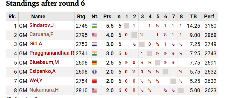 points ahead of 2nd seed Fabio Caruana. Sindarov is the Leader of the pack. Sindarov defeated all but, Matthias Blübaum who were able hold Sindarov off with a draw, and Anish Giri who plays him next in round 7 Sindarov Plays for a win= if he gets an advantage, is taking chances with white - try to win,