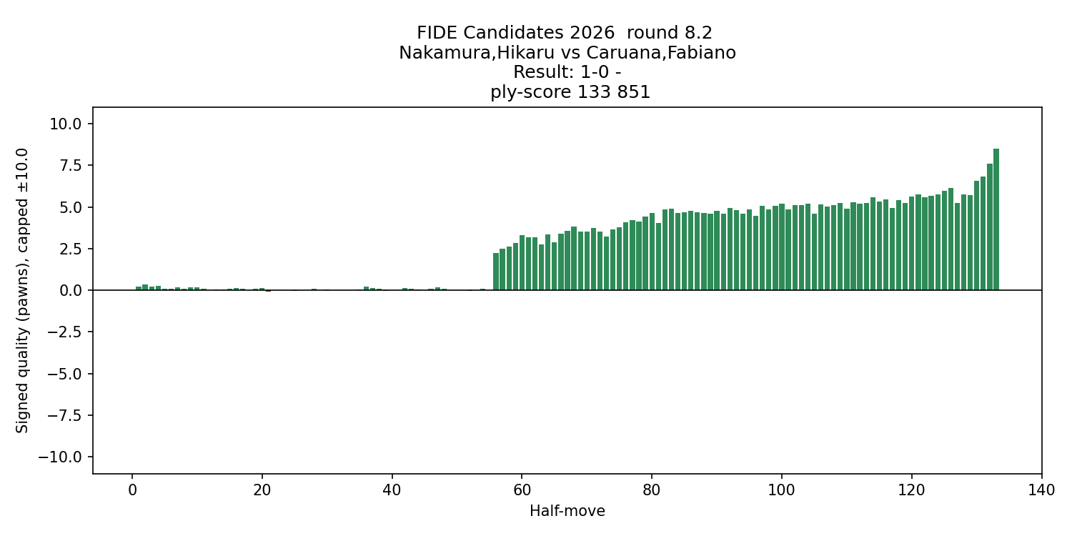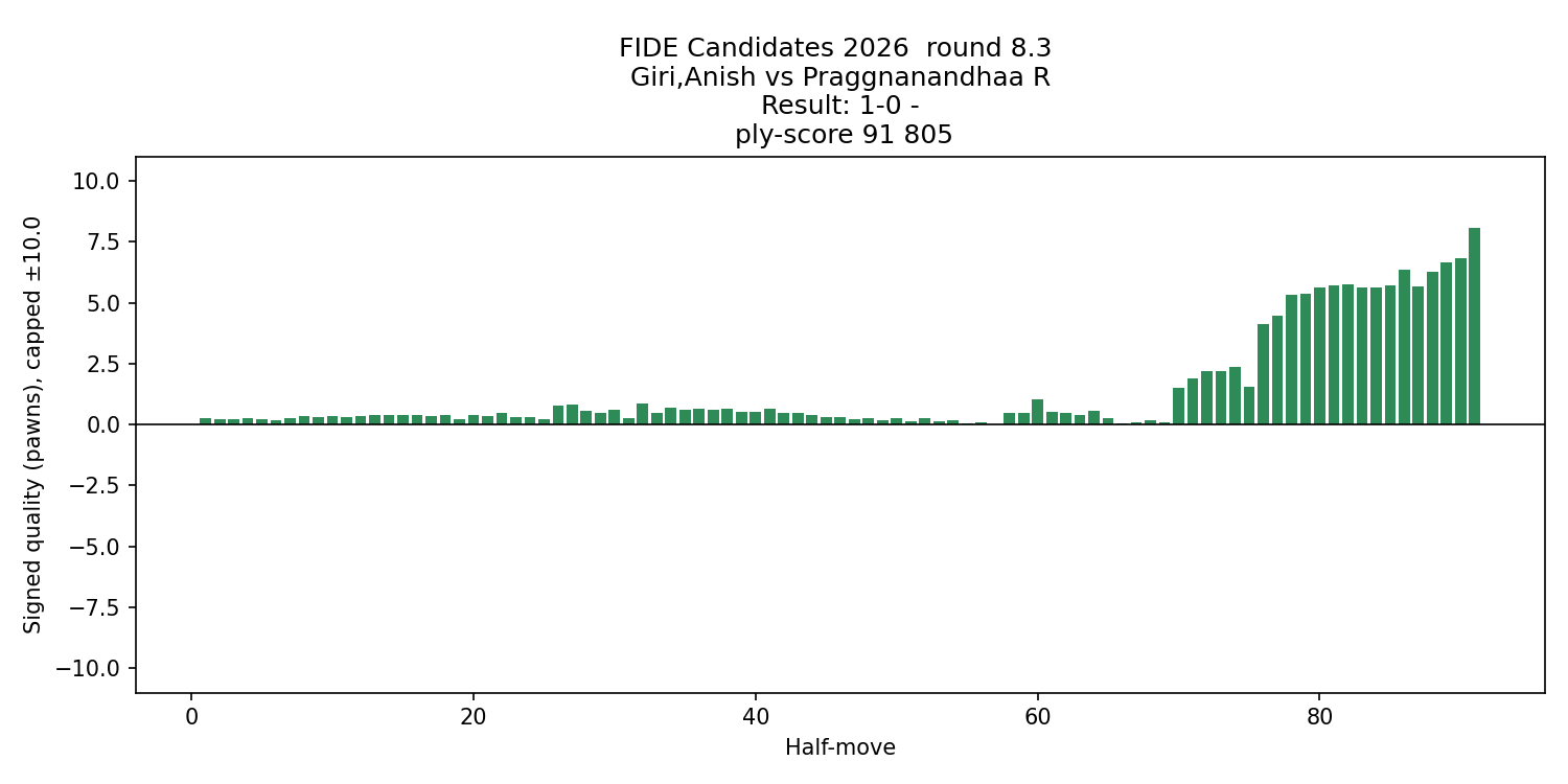 Despite Nakamura’s victory in this round, Sindarov remains firmly in control of the tournament. With only six rounds remaining, Nakamura would likely need an almost perfect finish combined with a significant collapse from Sindarov to catch the leader. Anish Giri scored an important victory today against R. Praggnanandhaa, moving into a tie for second place with Fabiano Caruana, both now two full points behind the tournament leader Javokhir Sindarov. The song for round 8 is Driver's Seat by Sniff'n The Tears Round 9 could help clarify the battle for second place, as both Caruana and Anish Giria play each other. Each player will also have a direct opportunity to close the gap in their head-to-head games against Sindarov in rounds 11 and 13. Notably, both Caruana and Anish Giri will have the white pieces against the tournament leader, giving them a valuable chance to challenge Sindarov’s commanding lead.