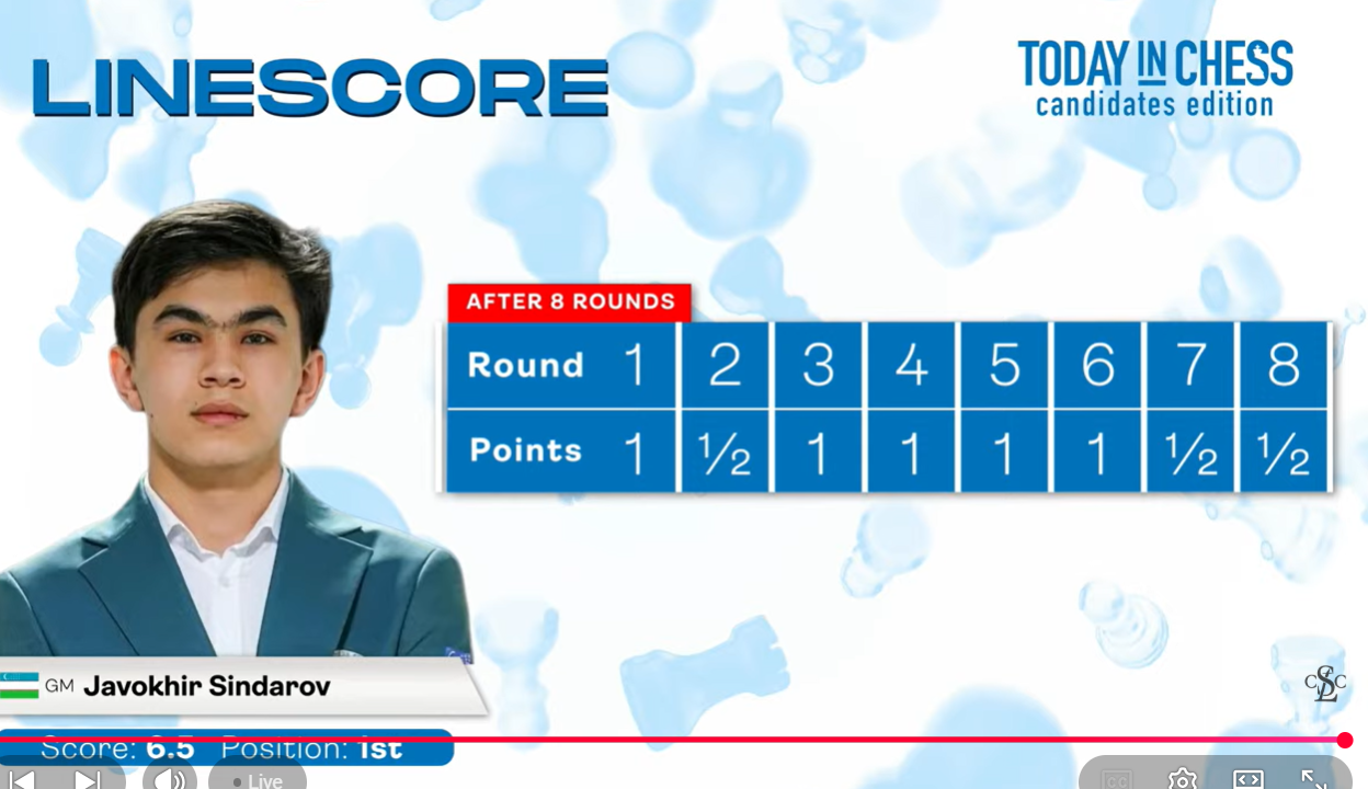 Javokhir Sindarov, who are both under 21. Kasparov reasoned , Chess is getting younger because they have access to so much information which compensates lack of experience. Sindarov playing with extreme confidence, very fast, no mistakes or blunders Love to see a Sindarov vs Carlsen match, that would be a real world championship. Hypothetically - Gukesh vs Sindarov- Gukesh is very stable. Would be surprised if the match was not close. A Match has different dynamics, there is a different logic so it will be interesting how he's [Sindarov] going to handle his new status, providing he is the candidate. Garry felt Fabiano Caruana was going to draw the rook ending with Nakamura[Fabiano missed played the ending and lost]. As far as what Fabiano has to do to win this tournament. its tough, the pressure. Fabio has to try to win every game. His loss lo to Sindarov in round 4, it's how Fabiano lost to Sindarov. Fabiano was out played in the opening. Laser, laser type finish by Sindarov . Fabiano has to get this game out of his mind. It Is not about losing, it was how he was defeated that matters. Fabiano has to concentrate on his only chance, with white, to defeat Sindarov.