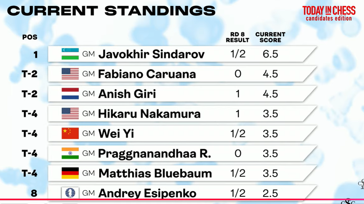 Round 8 helped solidify Sindarov’s position at the top of the standings, Putting him in the driver's seat. After drawing his game with Audrey Esipenko, he maintained first place and now holds a two-point lead over Fabiano Caruana. The round’s most notable result, however, was the awakening of the “sleeping giant,” Hikaru Nakamura, who finally scored his first win of the tournament by defeating the second seed, Caruana.